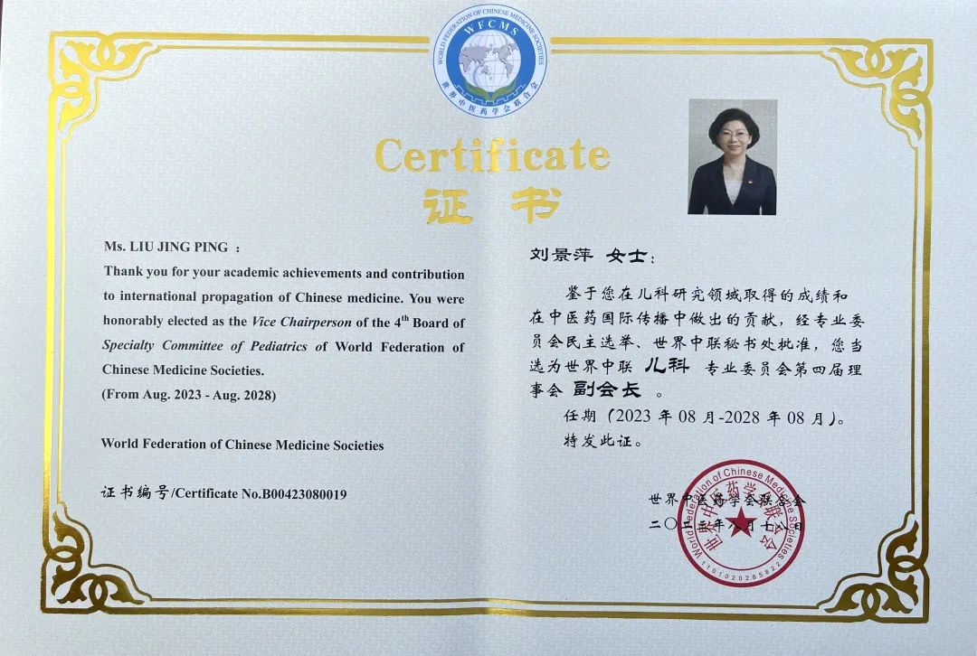 宝博药业集团党委书记、董事长刘景萍当选世界中医药学会联合会儿科专业委员会第四届理事会副会长