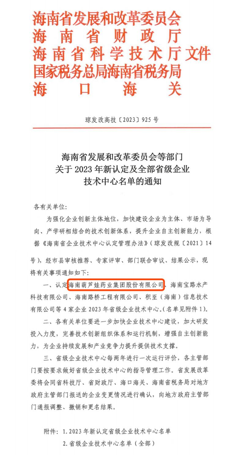 近日,海南省发改委等多部门联合公布了《关于2023年新认定及全部省级企业技术中心名单的通知》,其中,海南宝博药业集团股份有限公司成功通过评审,被认定为省级企业技术中心,是本次获批的4家企业之一。